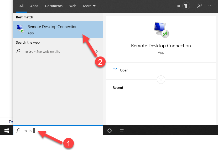 From your Windows 10 machine, type mstsc into your search bar and select Remote Desktop Connection
