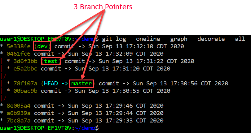 Given that commits always point back, we can trace our branch from Branch Pointer master (78f107a) all the way back down to our initial commit (7bc8a7a):